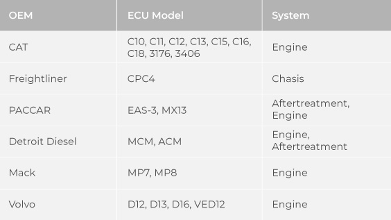 Our facility supports a wide range of ECMs across engine, chassis, and aftertreatment systems: